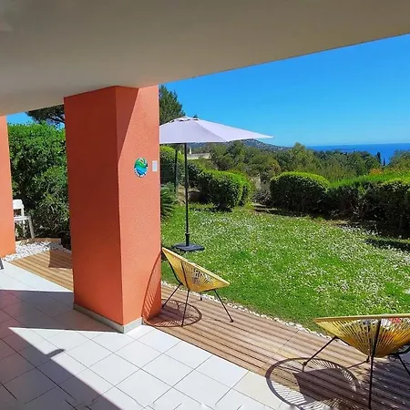 Les logements Green & Blue - Cap Esterel Clim, Vue Mer Et Jardin comprend un balcon, une terrasse et un coin salon avec une climatisation pour un plus grand confort. L'hébergement dispose de 1 chambre à coucher. Il y a 1 salle de bain avec une baignoire, fournis pour le confort des hôtes. Un sèche-cheveux sont également accessibles.